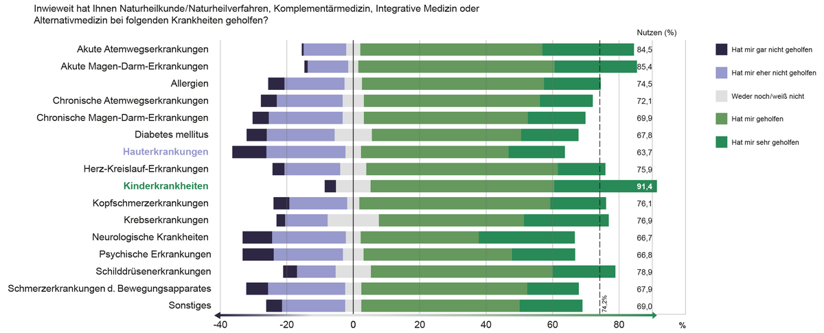 Die Befragten gaben an, dass ihnen TKIM überwiegend bei Kinderkrankheiten (91,4%), akuten gastrointestinalen Krankheiten (85,4%) und akuten Atemwegserkrankungen (84,5%) geholfen hatte, im Vergleich bei Hauterkrankungen (63,7%), neurologischen (66,7%) und psychischen Erkrankungen (66,8%) weniger.