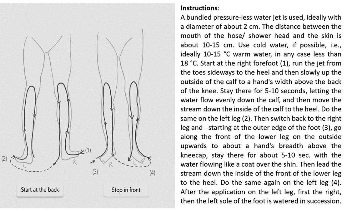 Die Hydrotherapie nach Kneipp bestand aus kalten Güssen (Wassertemperatur unter 18°C) bis zum Knie für 30-60 Sekunden. Optional durften die Teilnehmenden nach Belieben zusätzliche kalte oder im Wechsel auch warme Güsse der Knie und Arme sowie kalte Gesichtsgüsse anwenden. (9) Beide Verfahren durften auf Wunsch nach dem sechswöchigen Interventionszeitraum fortgeführt werden.