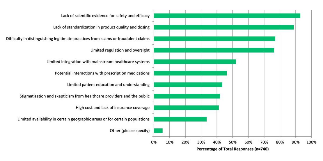 Befragt nach möglichen Problemen oder Herausforderungen mit CAIM nannten 92,97% das „Fehlen wissenschaftlicher Evidenz für Sicherheit und Wirksamkeit“, 88,78% das „Fehlen von Standardisierung in Produktqualität und Dosierung“, 77,03% die „Schwierigkeit, seriöse von unseriösen oder betrügerischen Angeboten zu unterscheiden“ und 76,35% „begrenzte Regulierung und Beaufsichtigung“.