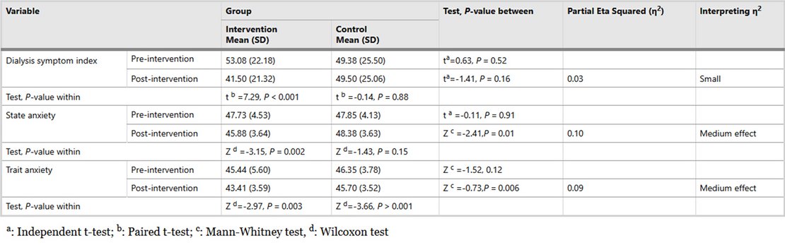 Um die Auswirkungen auf die Angst zu beurteilen, kam das State-Trait-Angstinventar (STAI) zum Einsatz. Das STAI besteht aus 40 Selbstbeurteilungs-Fragen mit einer 4-Punkte-Likert-Skala und unterscheidet zwei Arten von Angst: Angst als (vorübergehender) Zustand und Angst als Eigenschaft (der Persönlichkeit). Die Symptombelastung wurde mittels Dialyse-Symptom-Index (DSI) erfasst, welcher die Ausgeprägtheit von 30 Symptomen mittels einer 5-Punkte-Likert-Skala abfragt. Zu Beginn der Studie waren die Werte beider Gruppen im STAI und DSI vergleichbar.